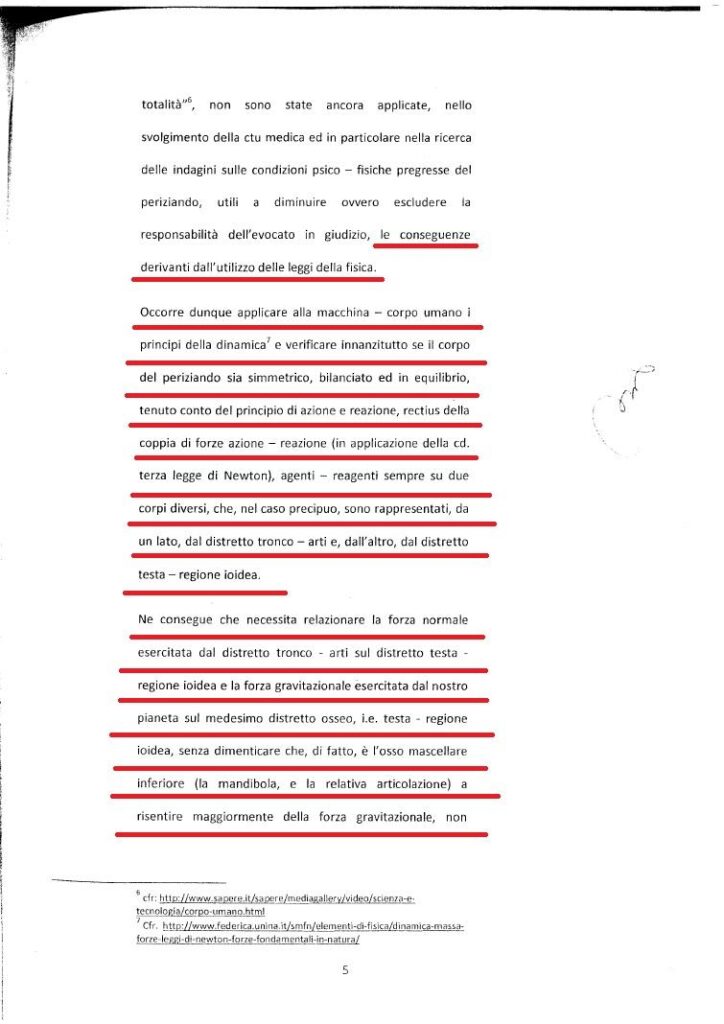 Con enorme soddisfazione pubblico questo documento giudiziaro che crea un precedente importantissimo per la collettività in quanto afferma un principio fondamentale sull’indagine nella disciplina medico giudiziaria (ma non solo) ovvero il principio di tenere conto della simmetria-scheletrica-muscolare (equilibrio meccanico) tenendo conto del principio fisico meccanico della terza legge di Newton.