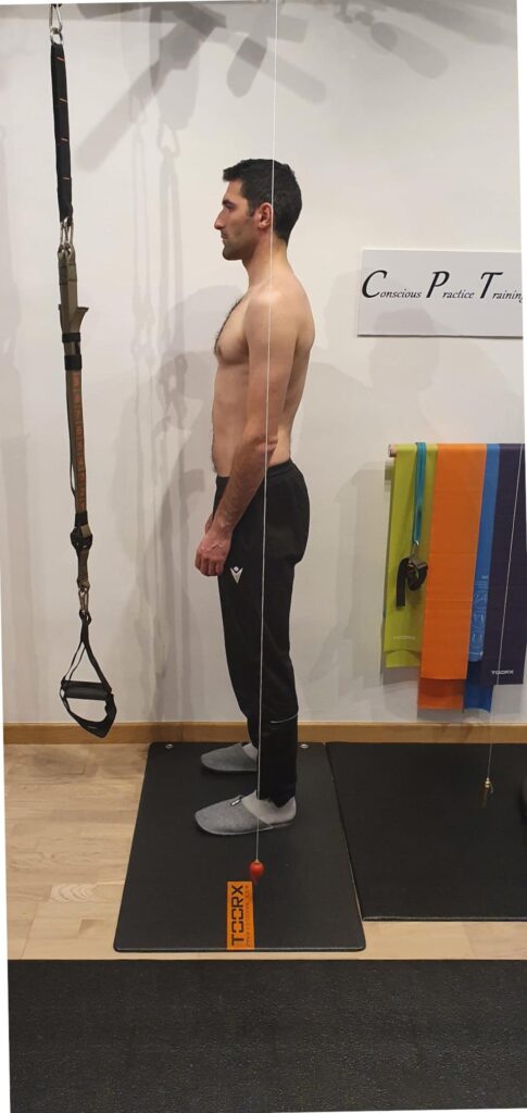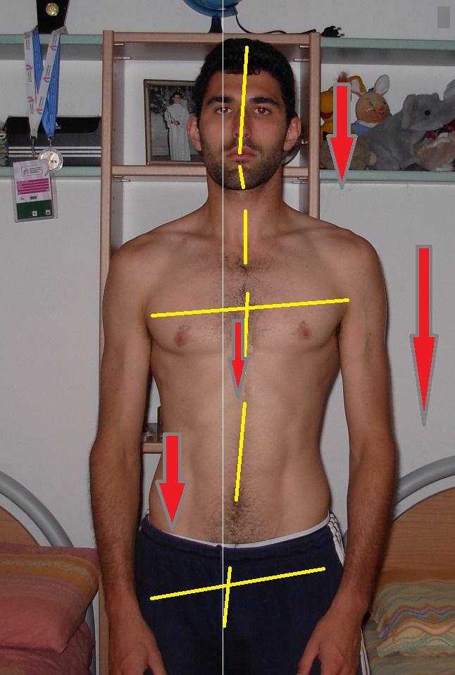 Alleghiamo un’immagine scattata all’inizio del riequilibrio con CPT-OG, in cui il DMA risulta ancora ben evidente. Il corpo mostrava una tendenza a cedere verso sinistra (lato destro dell’immagine), compensando su alcune aree anatomiche a destra.
