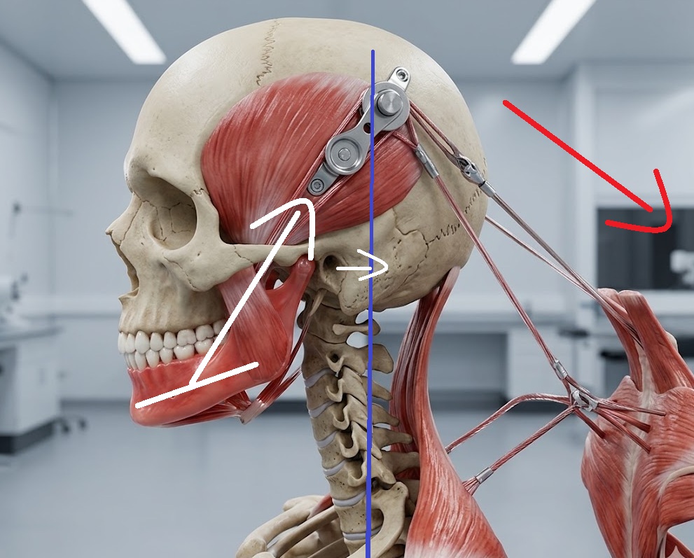 L’evidenza MECCANICA che questo muscolo elevando la mandibola AIUTA a sostenere la testa, è matematica.