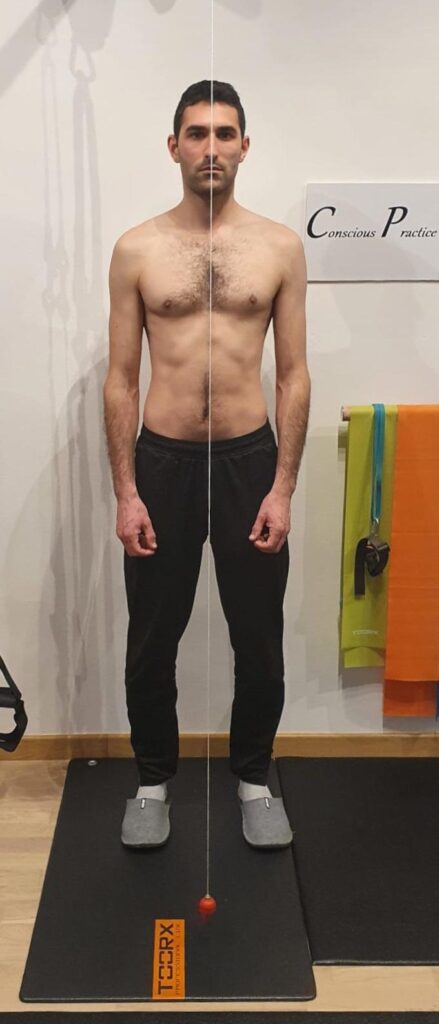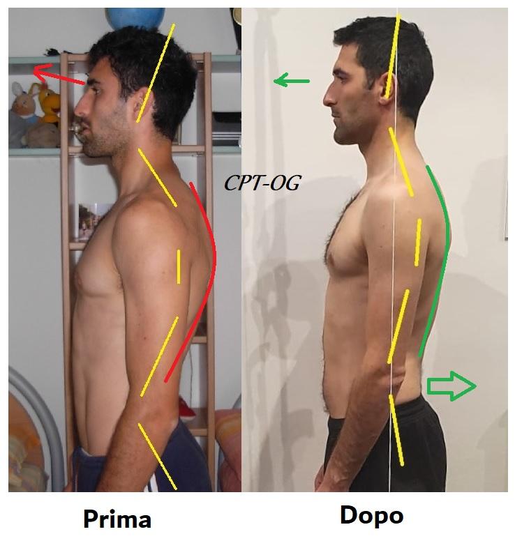 Vi allego un’immagine a inizio riequilibrio con CPT-OG; il suo DMA era ancora molto evidente. Il suo corpo cedeva a sinistra (destra immagine) e compensava su alcune parti anatomiche a destra: