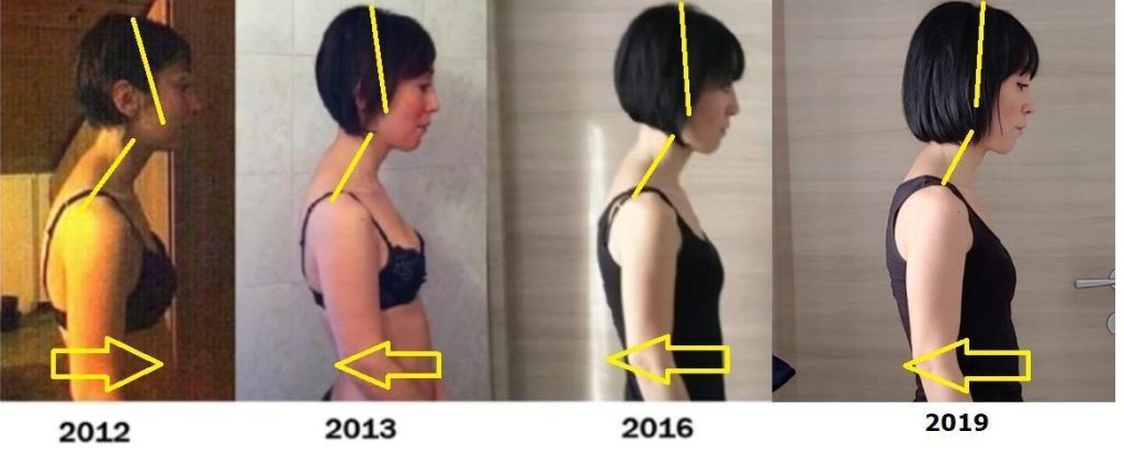 I guai grossi sono comunque cominciati dopo il parto della mia seconda figlia: durante l’allattamento ho perso due denti (giudizio e molare a dx) che non ho più rimesso per una successiva infezione all’osso sottostante (fortunata eh?) e ho dovuto fare un paio di capsule a sx. Ho cominciato da allora a soffrire di frequenti mal di collo e a incurvarmi sempre più: tutti mi dicevano di stare dritta ma io non ci riuscivo proprio!